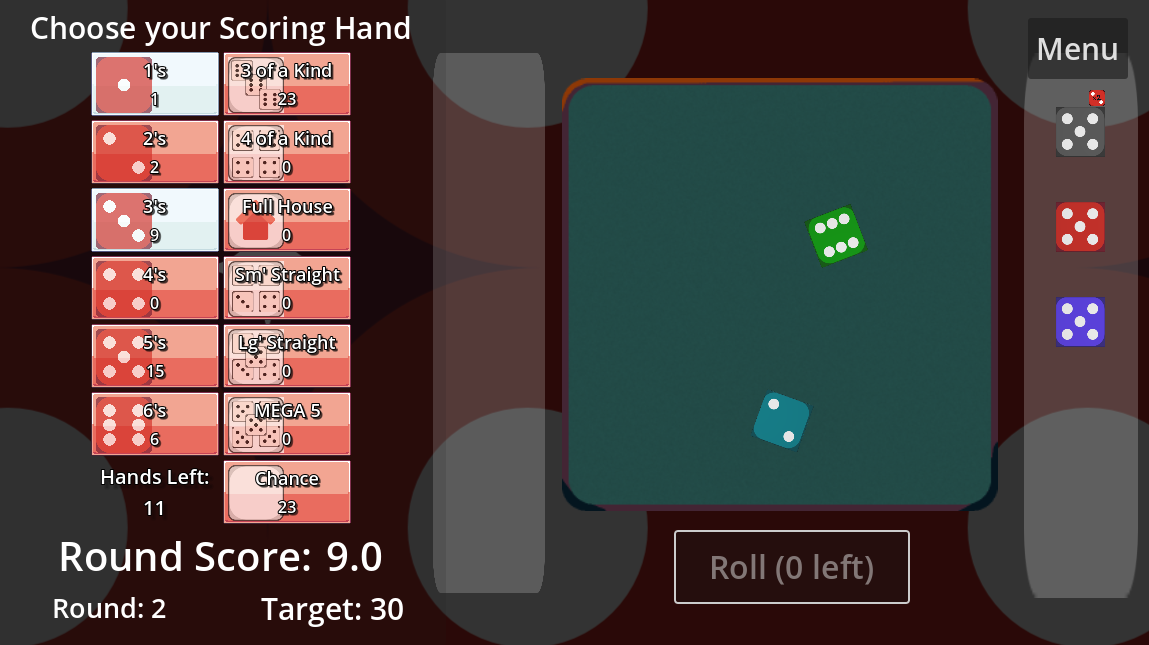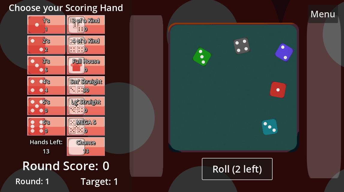 Roll dice, score hands, take modifiers and see how high you can take your score!